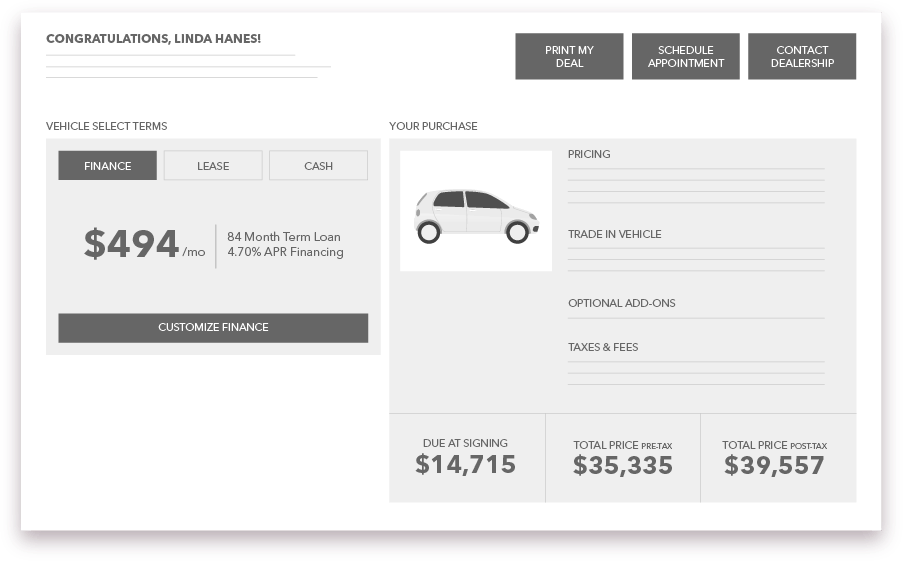 We’ll add in all appropriate taxes and fees, so there are no surprises at the dealership. You’ll be able to see your finalized deal from the comfort of your own home.