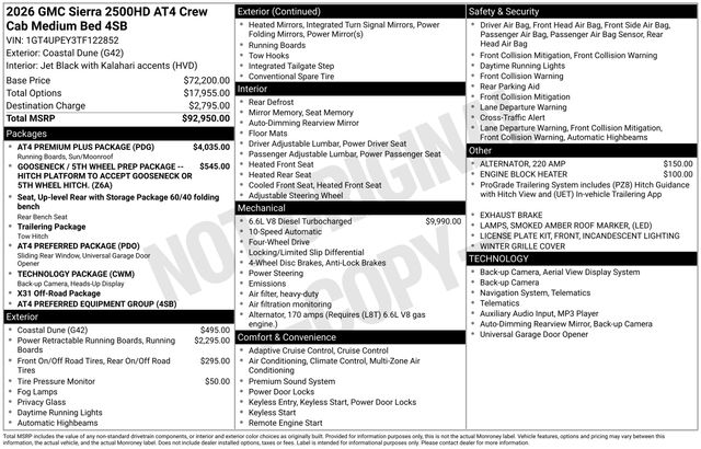 Coastal Dune 2026 GMC Sierra 2500HD AT4 Duramax 6.6L V8 Turbodiesel 4WD 10-Speed Automatic 4D Crew Cab